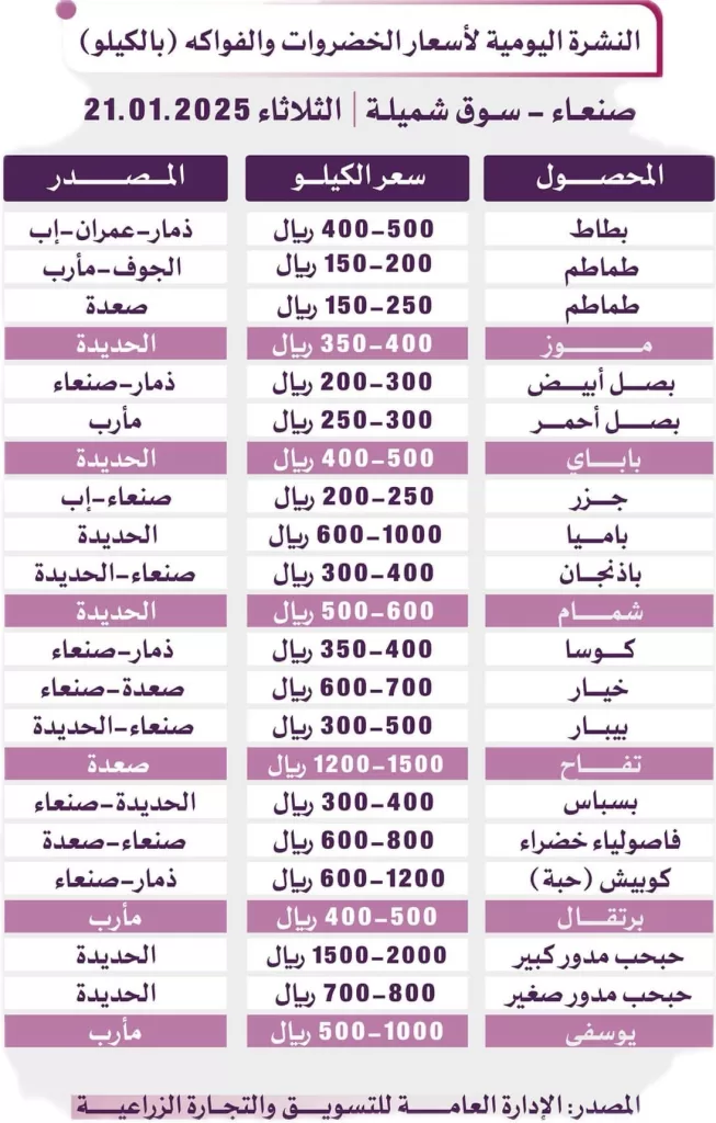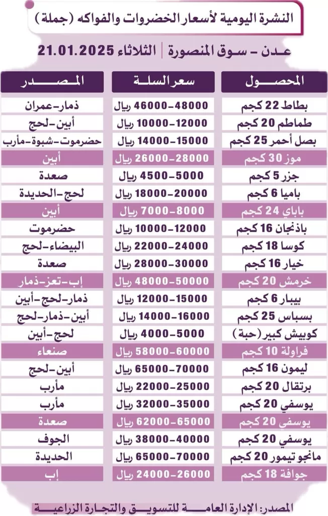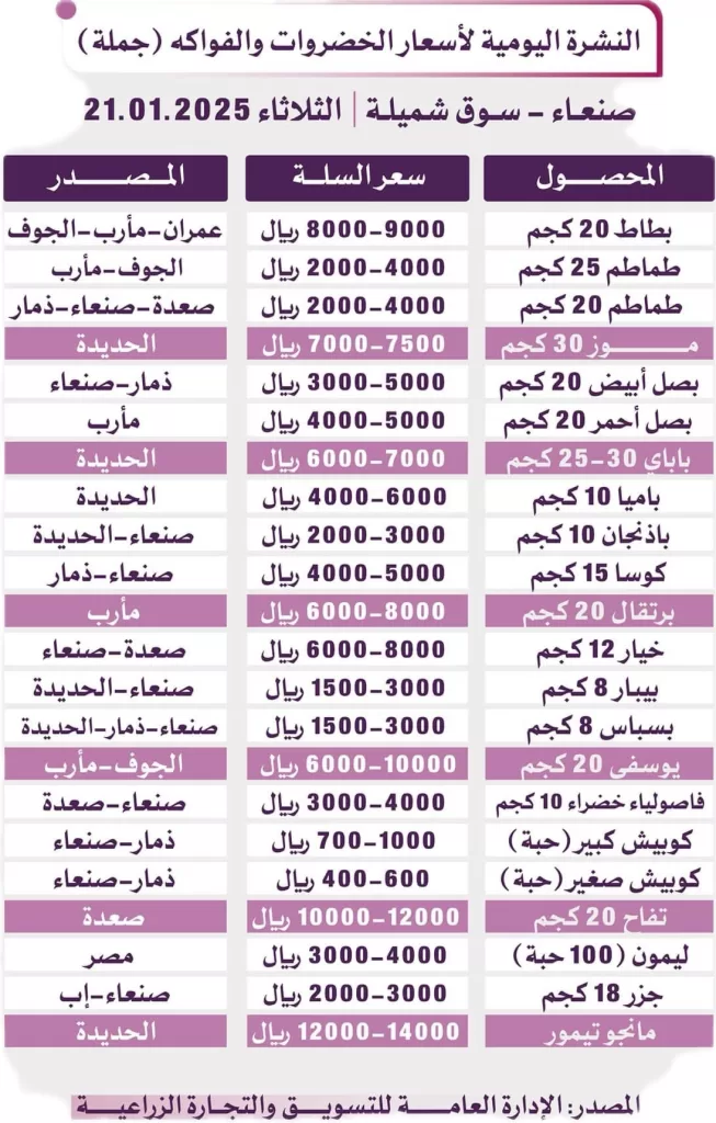أسعار الخضروات والفواكه بالجملة في الأسواق اليمنية – 21 يناير 2025