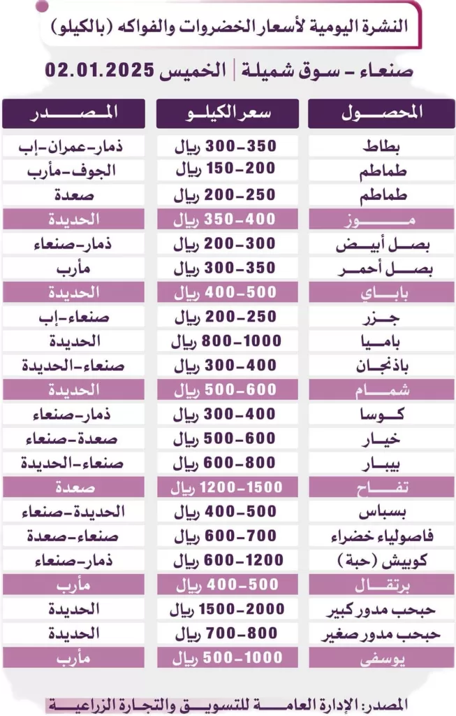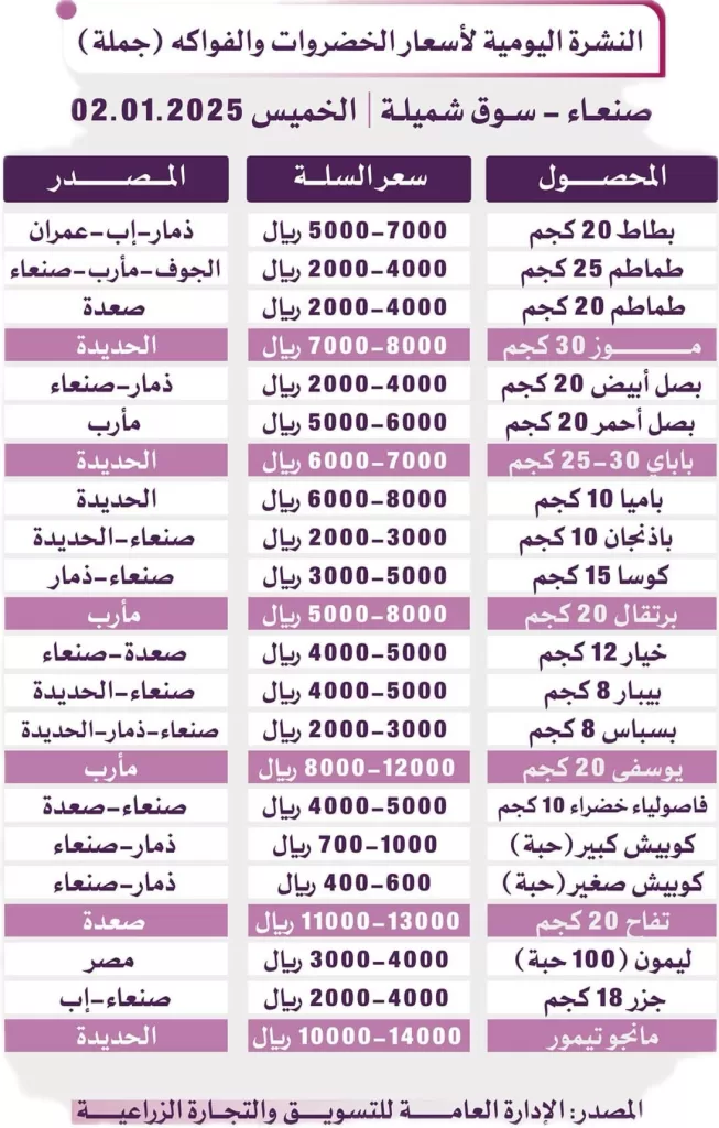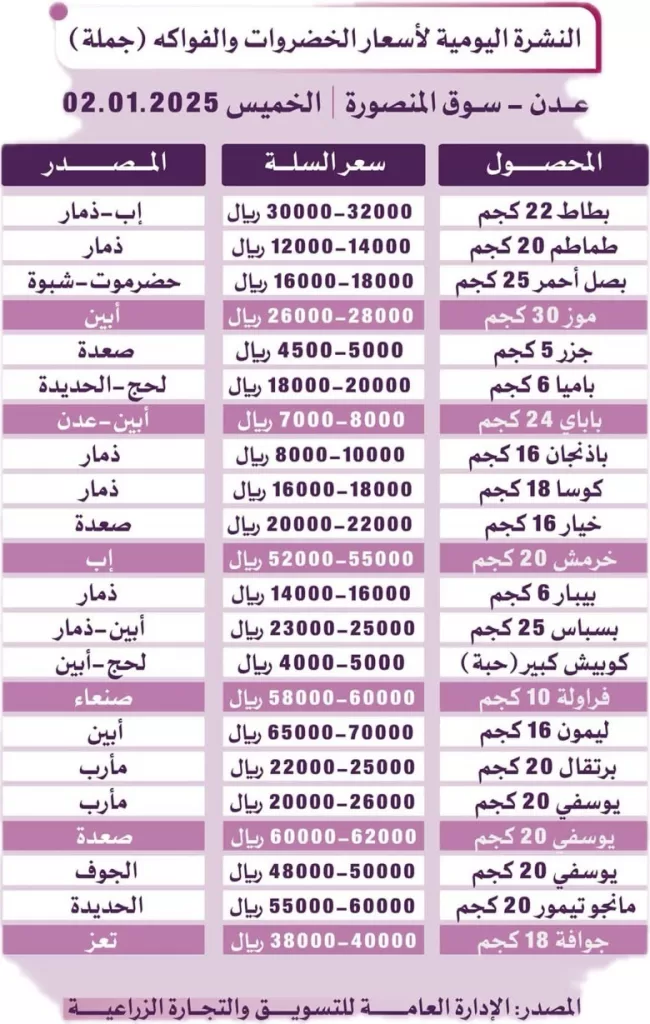 النشرة اليومية لأسعار الخضروات والفواكه في صنعاء وعدن – الخميس 2 يناير 2025
