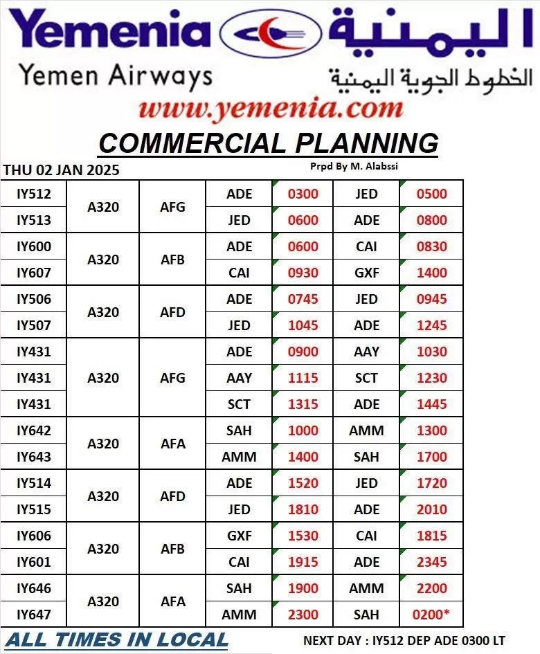 • الرحلة IY431: الإقلاع من عدن الساعة 09:00 صباحاً والوصول إلى سيئون الساعة 10:30 صباحاً.