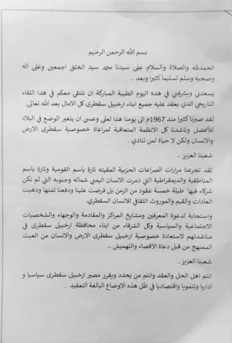 سقطرى – خاص بـ (صحيفة شاشوف): شهدت الأرخبيل اليمني سقطرى تطورات جديدة، حيث أعلن “المجلس الوطني لأبناء أرخبيل سقطرى” عن إقامة حكم ذاتي كامل الصلاحيات للأرخبيل. جاء هذا الإعلان بعد ما وصفه المجلس بـ “التفاوض مع الحكومة ممثلة بالمجلس الرئاسي”، مدعياً أن هذا القرار جاء استجابة لـ “البعد الجغرافي اللغوي والبيئي والإثني” لسقطرى.