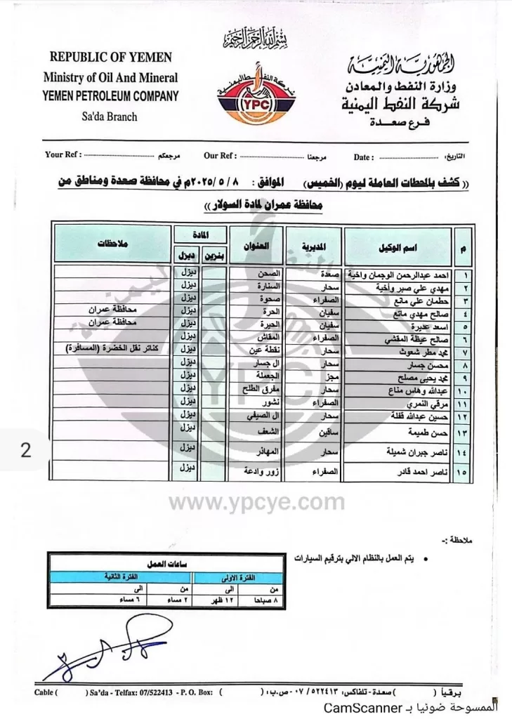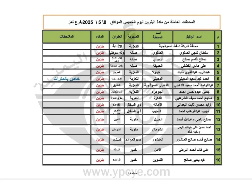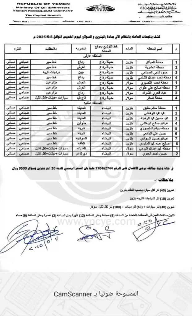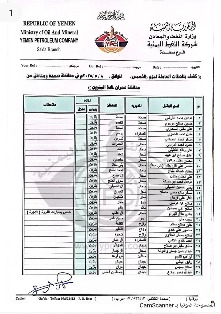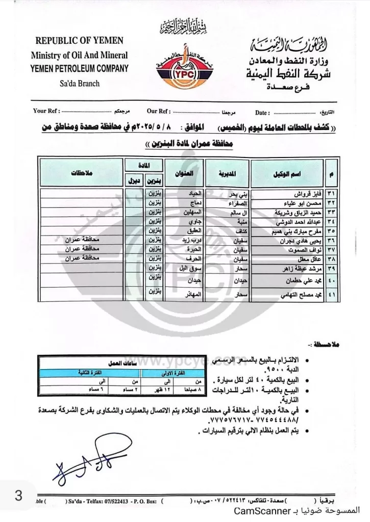 تعز، صعدة، عمران، صنعاء، اليمن – أعلنت شركة النفط اليمنية وفروعها في محافظات تعز وصعدة وعمران وأمانة العاصمة صنعاء عن كشوفات تفصيلية بأسماء المحطات العاملة ليوم الخميس الموافق 8 مايو 2025م، وذلك لتوفير مادتي البنزين والديزل للمواطنين. وتضمنت الكشوفات أسماء المحطات ومواقعها وأنواع الوقود المتوفرة فيها، بالإضافة إلى تحديد الفئات المستفيدة وكميات التموين المخصصة في بعض المناطق.