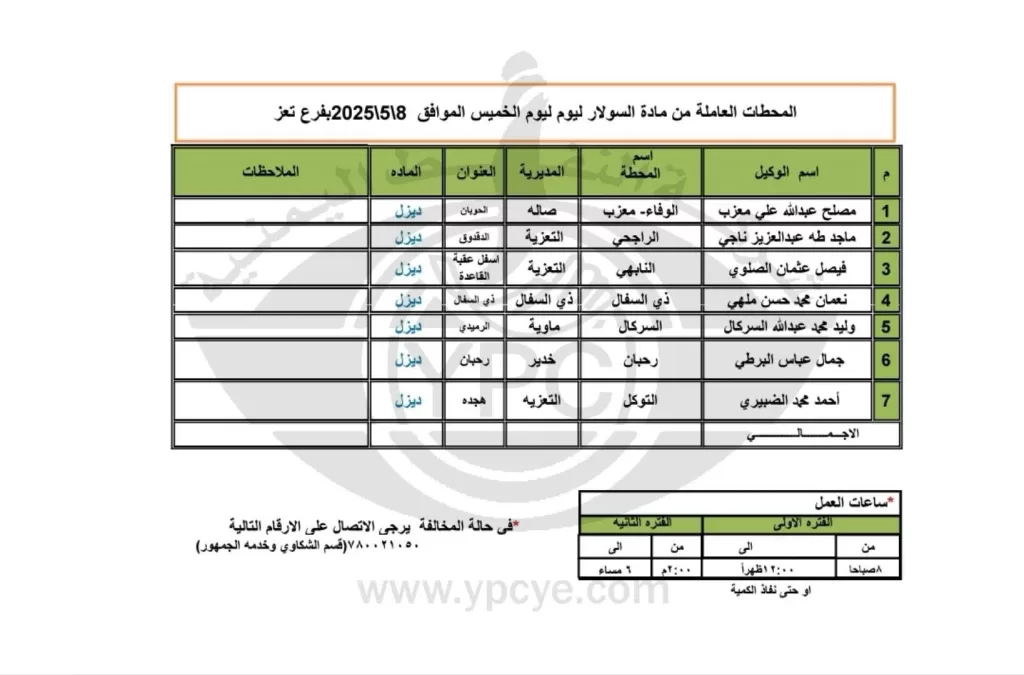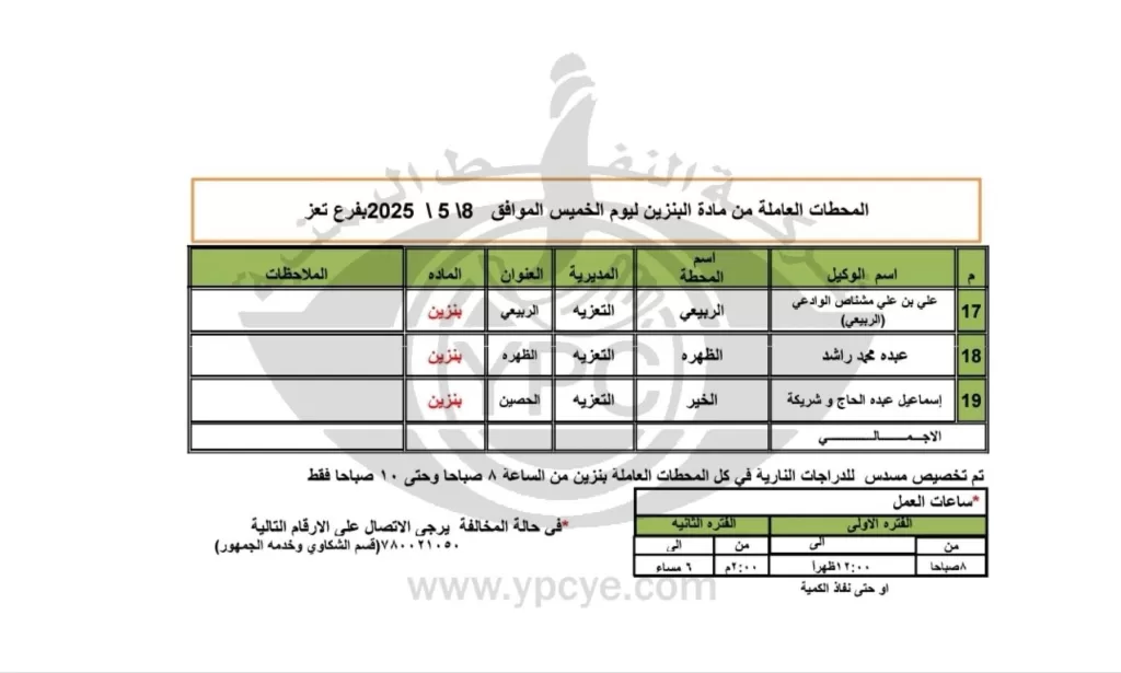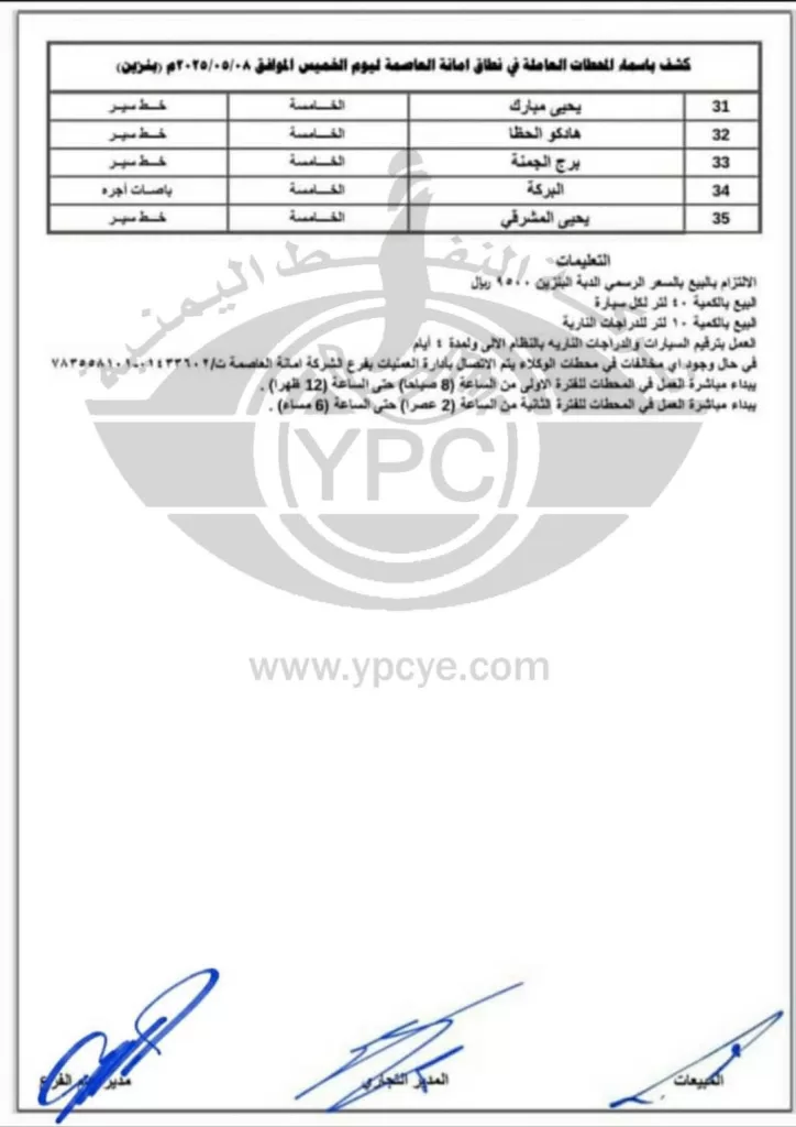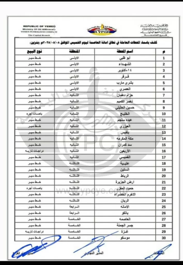 شركة النفط اليمنية تعلن عن محطات الوقود العاملة في تعز وصعدة وعمران وأمانة العاصمة ليوم الخميس 8 مايو 2025