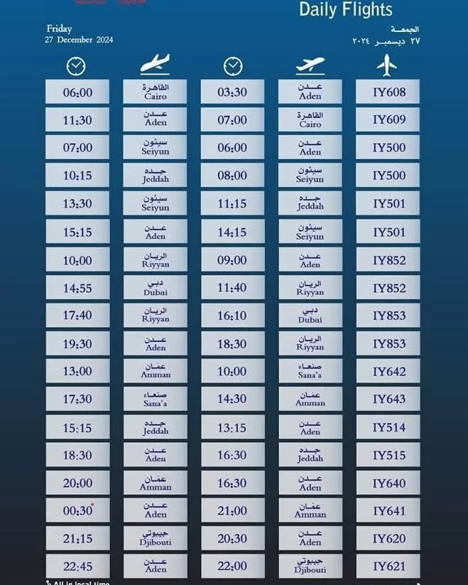 عدن، صنعاء – 26 ديسمبر 2024: أعلنت الخطوط الجوية اليمنية عن جدول رحلاتها ليوم الجمعة الموافق 27 ديسمبر 2024، والذي يضم رحلات داخلية ودولية تغطي عدداً من المدن العربية والعالمية.