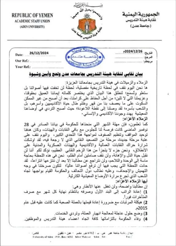 عدن – خاص: أعلنت نقابة هيئة التدريس بجامعات عدن، لحج، أبين، وشبوة عن تصعيد حركتها الاحتجاجية، وذلك احتجاجاً على تدهور الأوضاع المعيشية لأعضائها وتجاهل الحكومة لمطالبهم المشروعة.